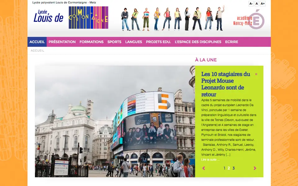 Accueil CMS lycee-cormontaigne-metz.fr lycee-cormontaigne-metz.fr 5 Sep 2012CMS, Web Septembre 2012 : mise en place de lycee-cormontaigne-metz.fr Site dynamique avec gestion de contenu Demo : http://www.lycee-cormontaigne-metz.fr Article précédent lilozen.fr Article suivant philippebies.fr